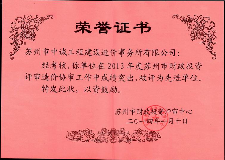 我公司被苏州市财政投资评审中心评为2013年度先进单位