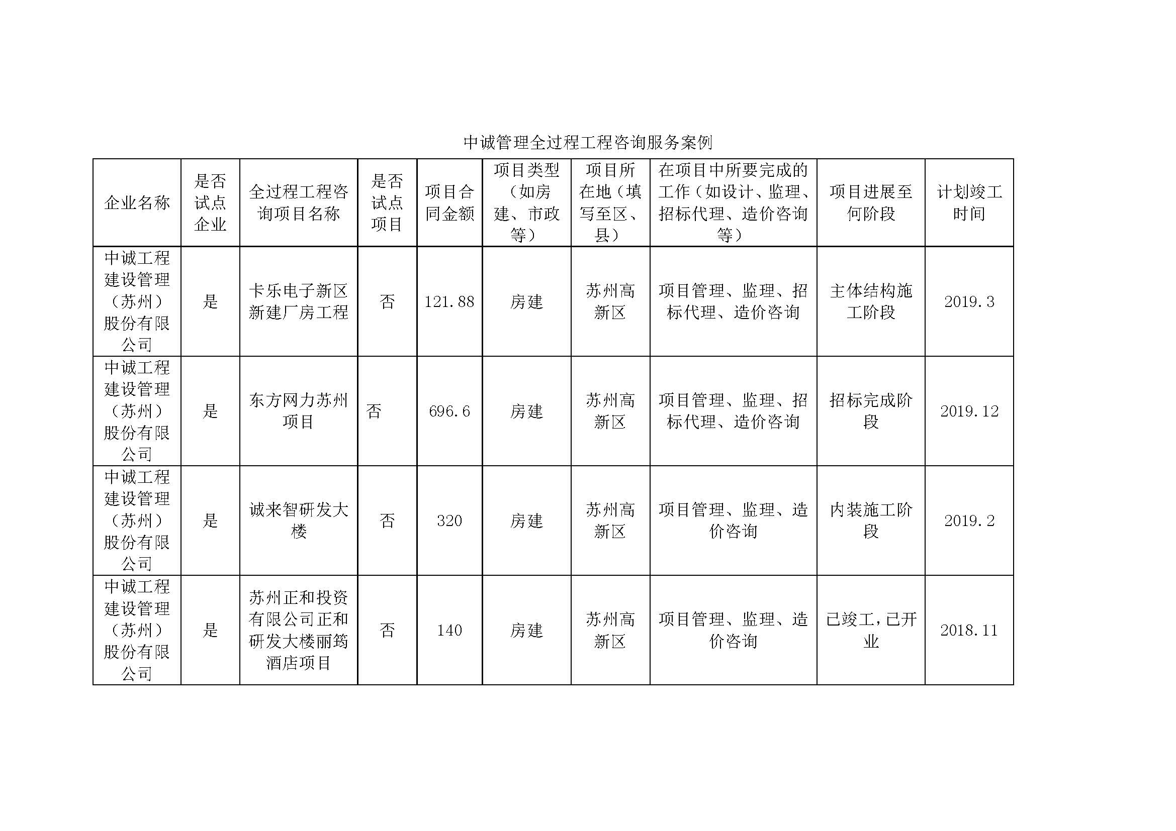中诚工程管理(苏州)股份有限公司是江苏省首批全过程工程咨询服务试点单位,AAAAA级信用单位,同时也是江苏省内造价咨询行业唯一的上市公司。中诚全过程工程咨询服务高度整合了我们现有的招标代理、造价咨询、项目管理、工程监理、设计优化、BIM建筑信息化优势专业,打造了一批高素质、高效率的专业队伍,助力项目实现更快的工期、更小的风险、更少的投资和更高的品质等目标,争当工程咨询行业进步的领头羊。