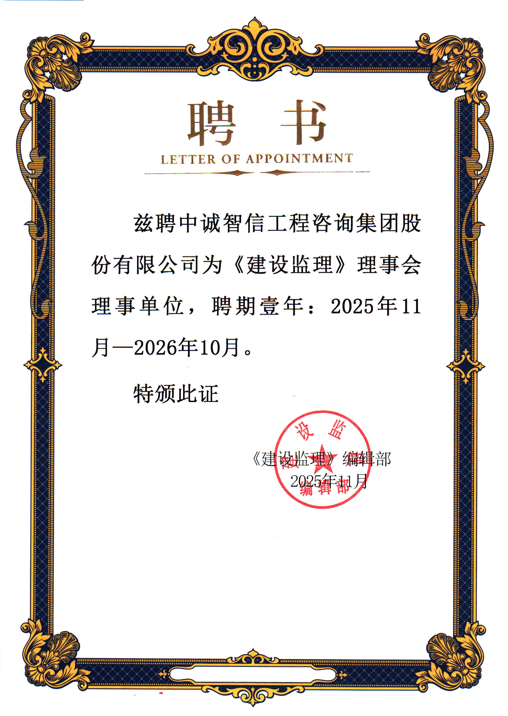 近日,中诚智信工程咨询集团股份有限公司正式获聘《建设监理》理事会理事单位,聘期为2025年11月至2026年10月。这一行业认可,标志着中诚咨询在监理领域的专业实力与行业口碑,得到了权威平台的高度肯定。